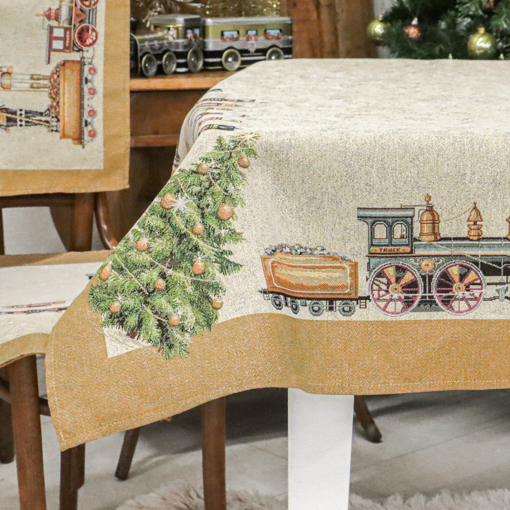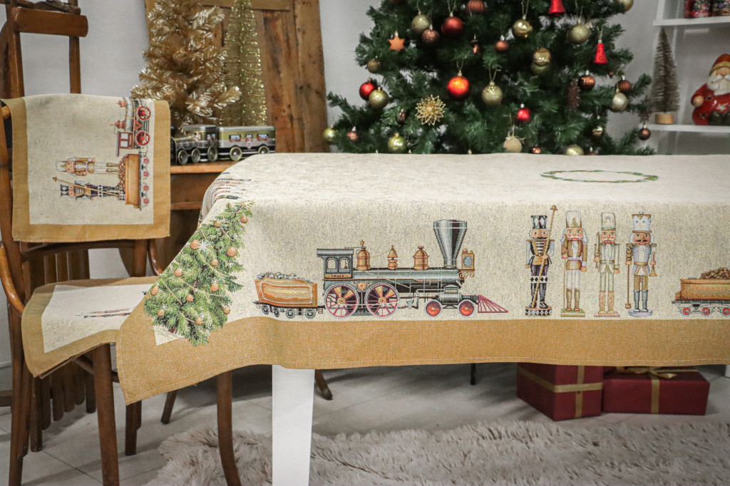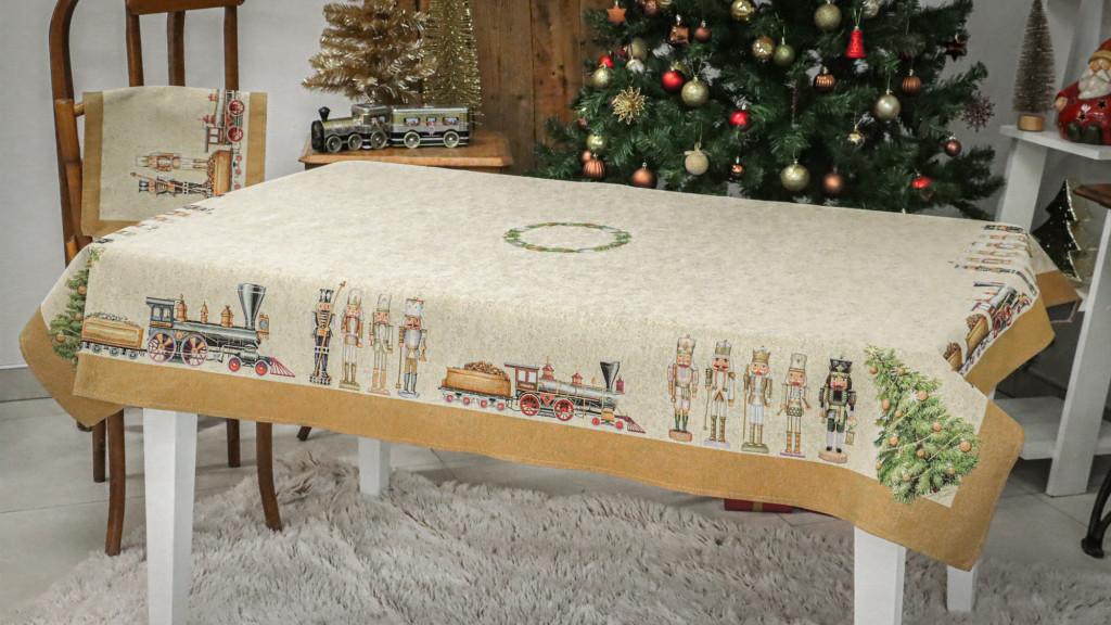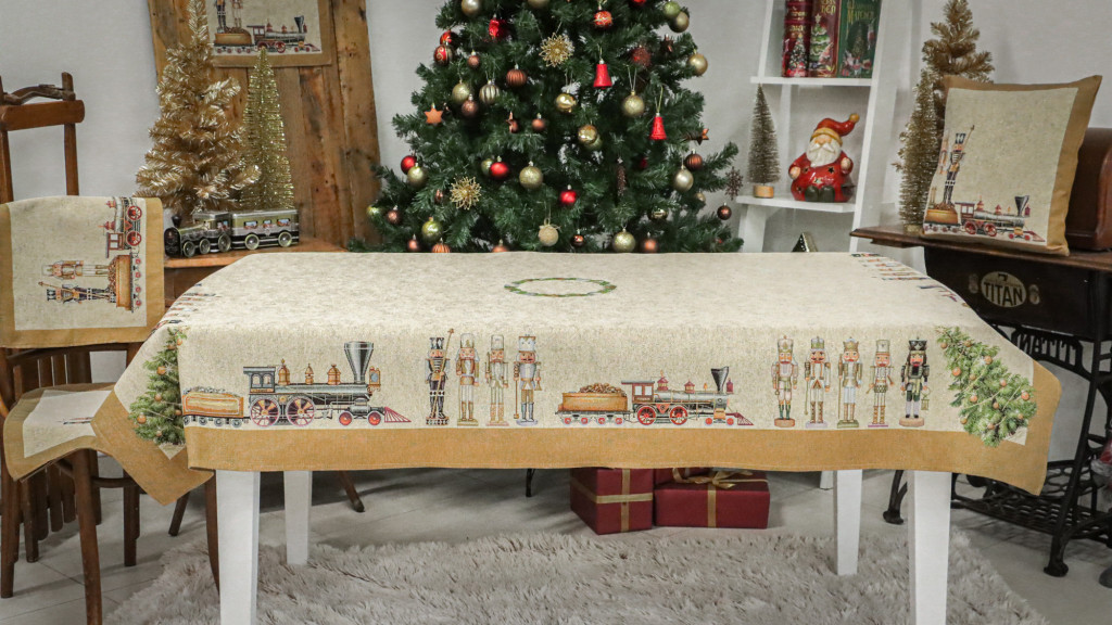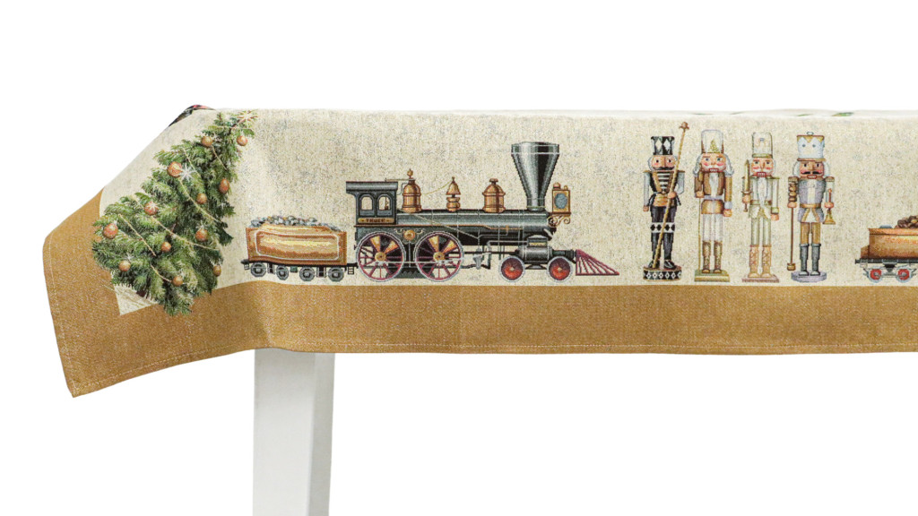 Diótörőkkel, karácsonyfákkal, kisvonatokkal és díszekkel dekorált karácsonyi asztalterítő. Anyaga vastag gépi gobelin, arany lurexes csillogása teszi igazán ünnepi hangulatúvá. Prémium minőségű termék, amely pompásan mutat az ünnepi asztalon. Megfelelő kezelés mellett hosszú évekig megőrzi szépségét és minőségét.