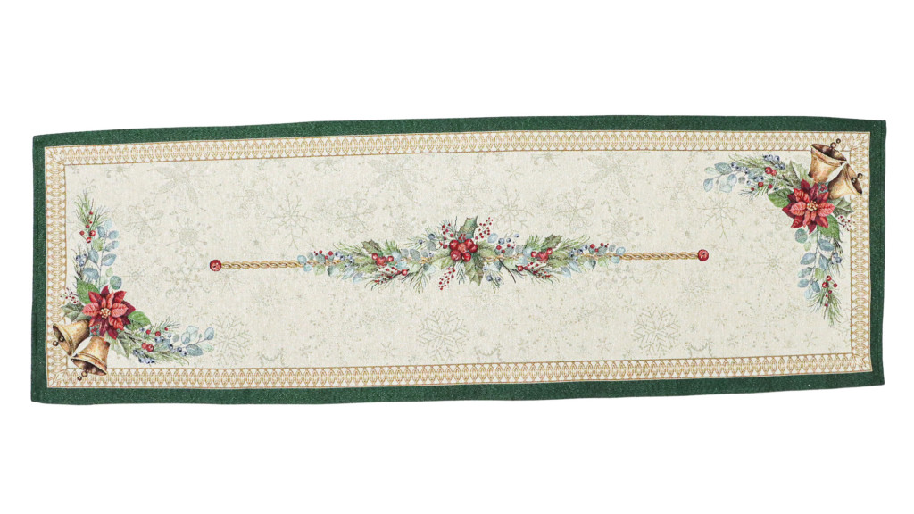 Csengőkkel, csipkebogyókkal, koszorúkkal dekorált karácsonyi asztali futó. Anyaga vastag gépi gobelin, arany lurexes csillogása teszi igazán ünnepi hangulatúvá. Prémium minőségű termék, amely pompásan mutat az ünnepi asztalon. Megfelelő kezelés mellett hosszú évekig megőrzi szépségét és minőségét.