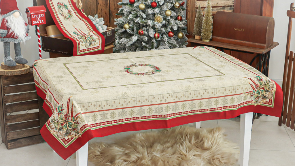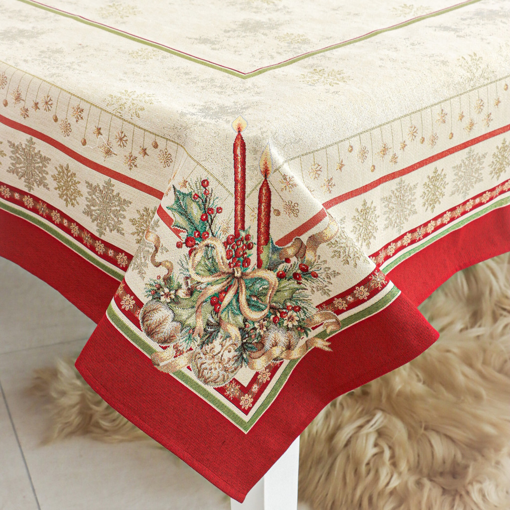 Ünnepi asztalterítő gyertyákkal, koszorúval és karácsonyi díszekkel. Anyaga gépi szövésű gobelin, amelyet arany lurexes szövés tesz még különlegesebbé.
