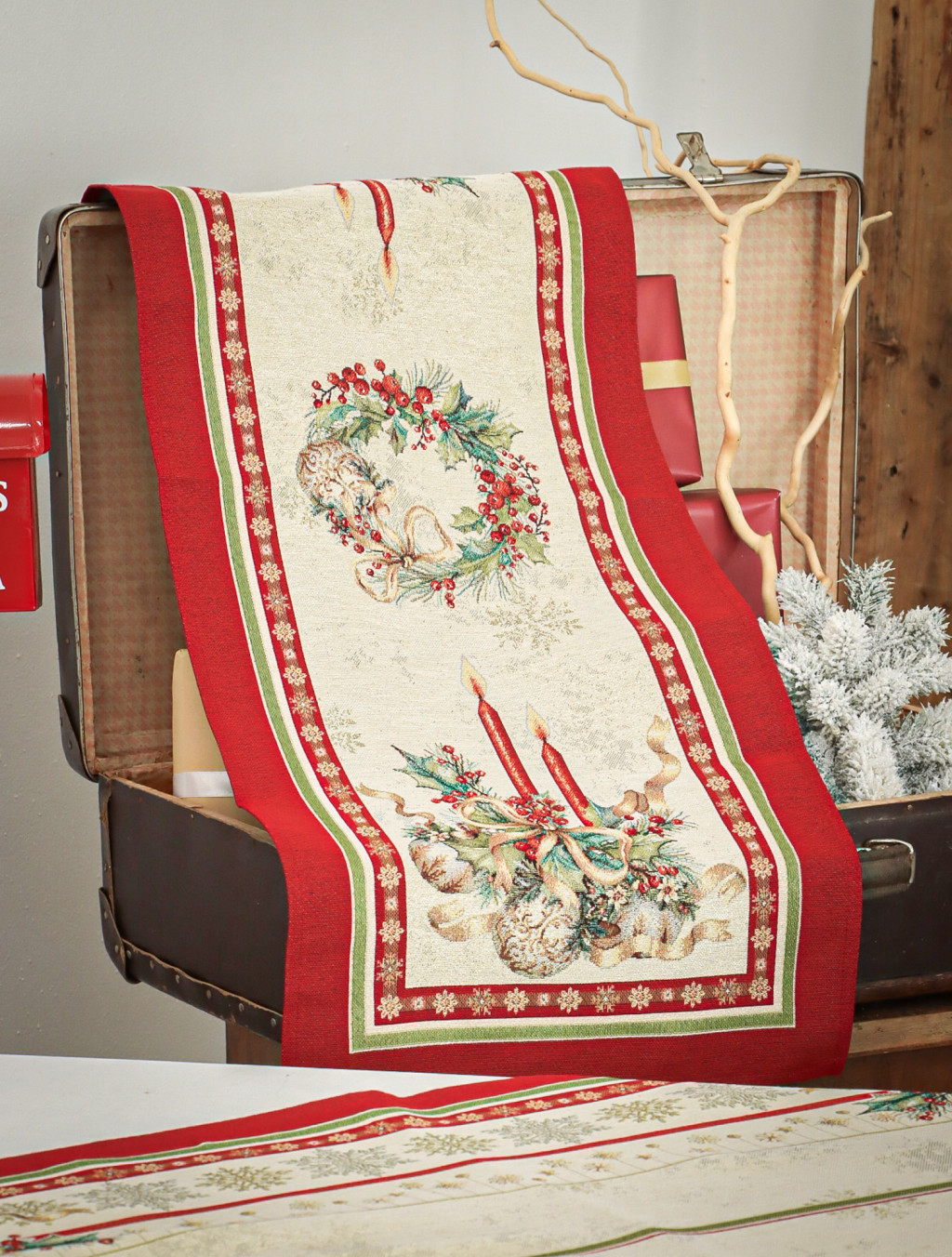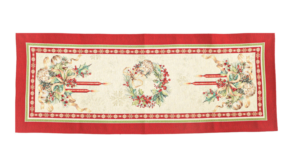 Ünnepi asztali futó gyertyákkal, koszorúval és karácsonyi díszekkel. Anyaga gépi szövésű gobelin, amelyet arany lurexes szövés tesz még különlegesebbé.