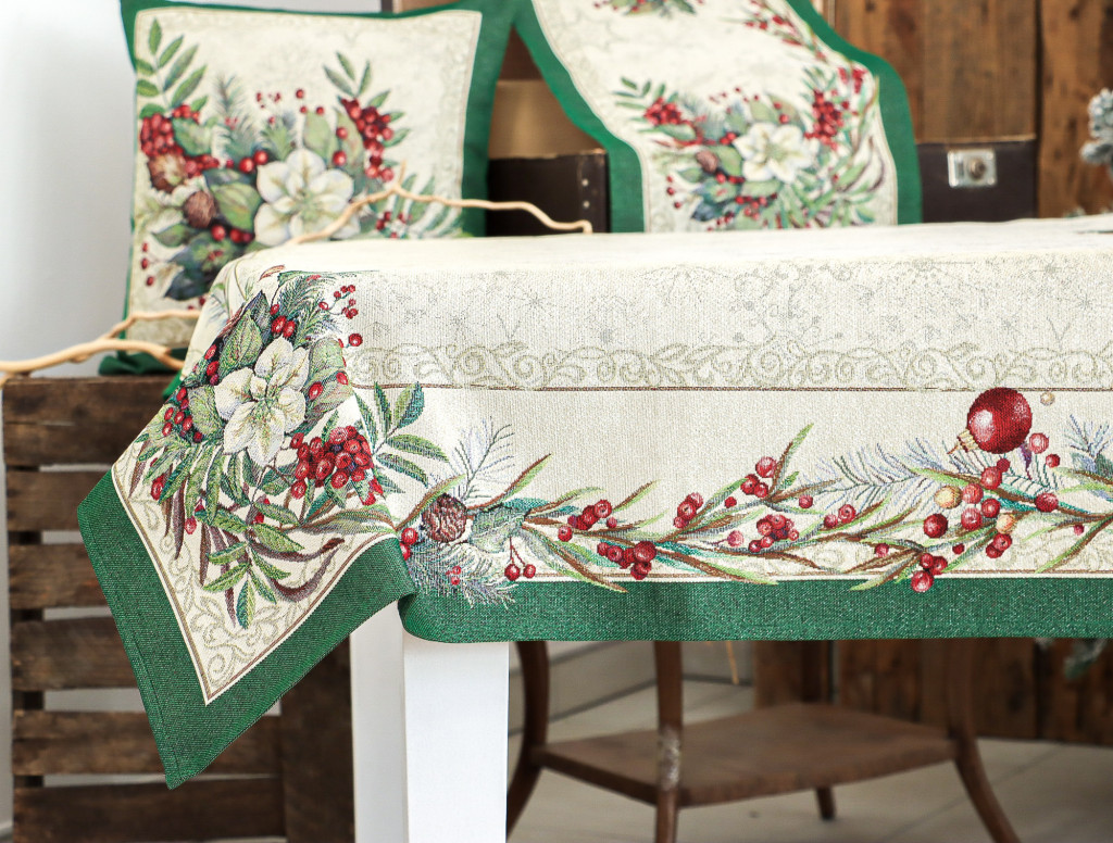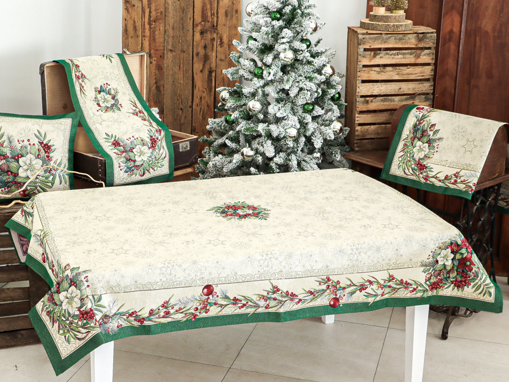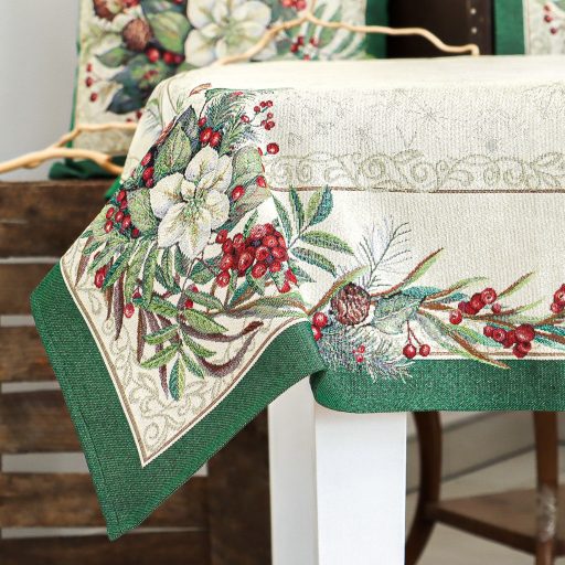 Ünnepi asztalterítő fehér virágokkal, piros bogyókkal és fenyőágakkal dekorálva. Anyaga prémium minőségű gépi gobelin, amelyet ezüst lurexes szövés tesz még különlegesebbé.