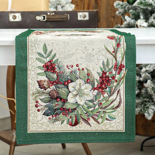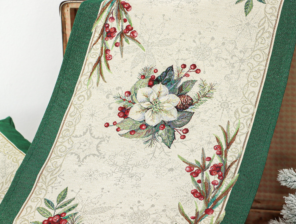 Ünnepi asztali futó fehér virágokkal, piros bogyókkal és fenyőágakkal dekorálva. Anyaga prémium minőségű gépi gobelin, amelyet ezüst lurexes szövés tesz még különlegesebbé.