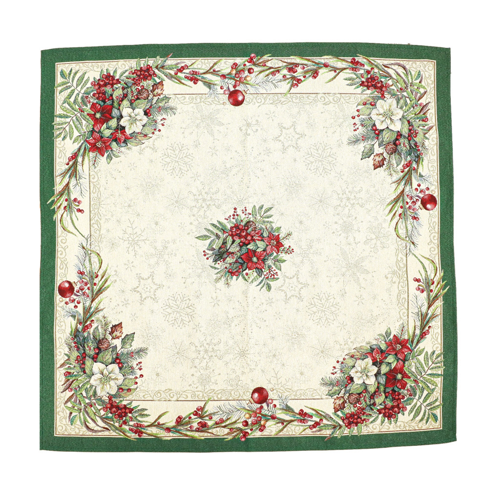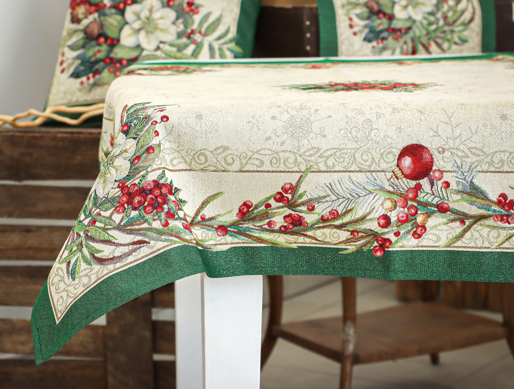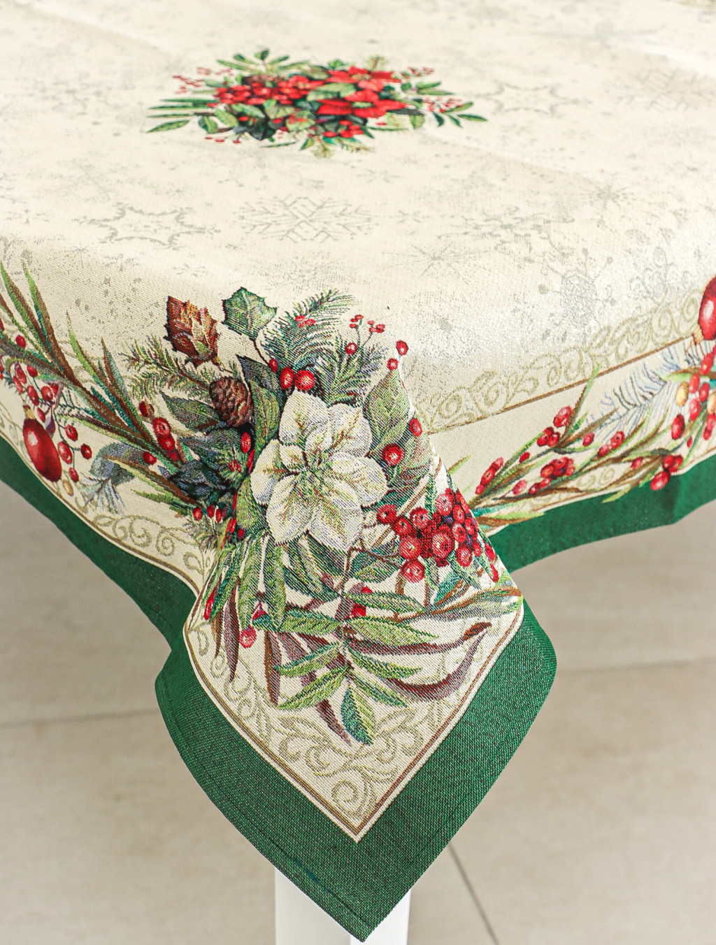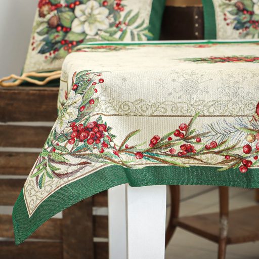 Ünnepi asztalterítő fehér virágokkal, piros bogyókkal és fenyőágakkal dekorálva. Anyaga prémium minőségű gépi gobelin, amelyet ezüst lurexes szövés tesz még különlegesebbé.