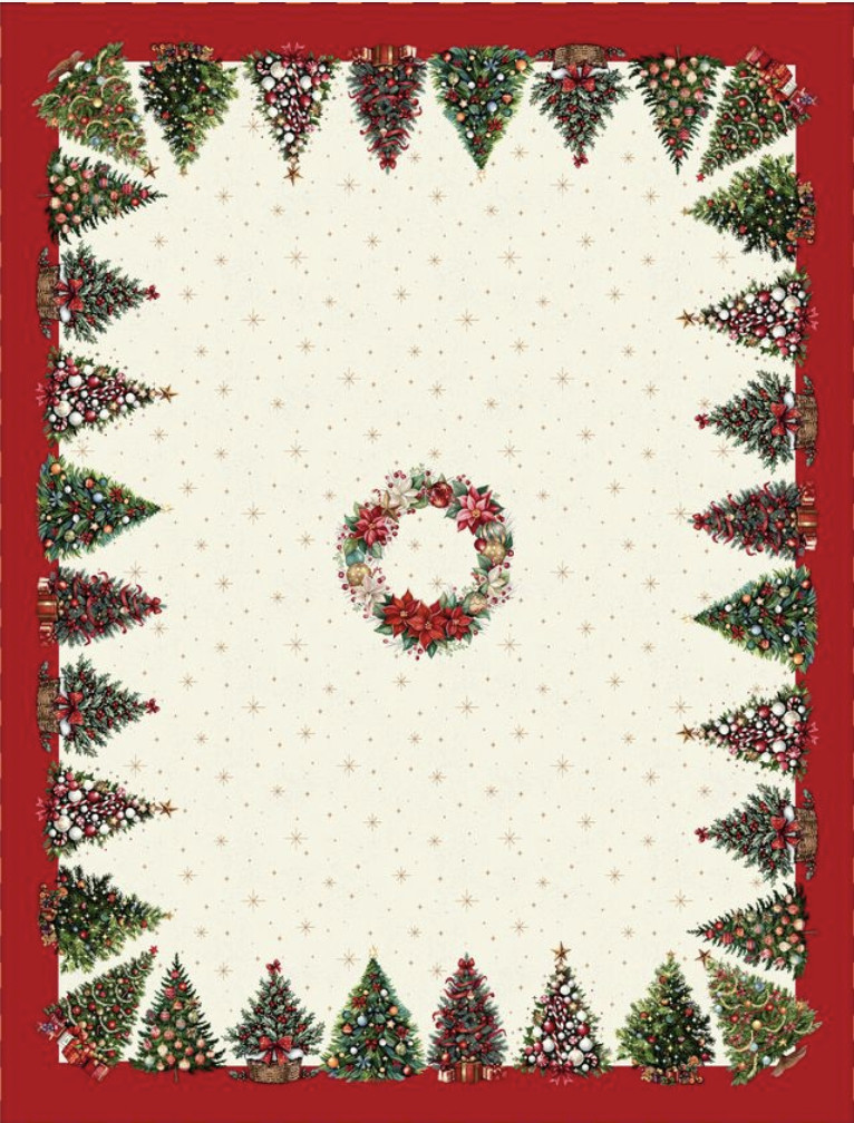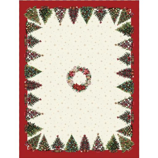 Karácsonyi, prémium minőségű asztalterítő, amelyet középen koszorú, szélein körbe díszített fenyőfák dekorálnak. Anyaga gépi szövésű gobelin, amelyet arany lurexes szövés tesz még különlegesebbé.