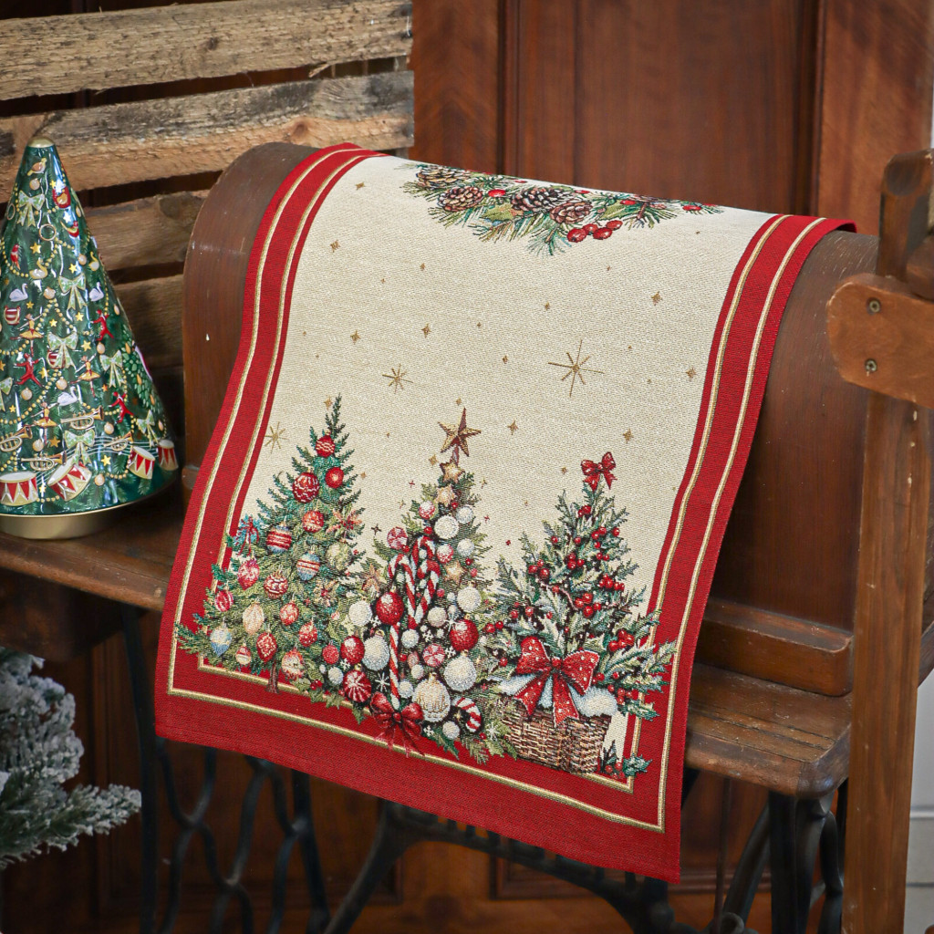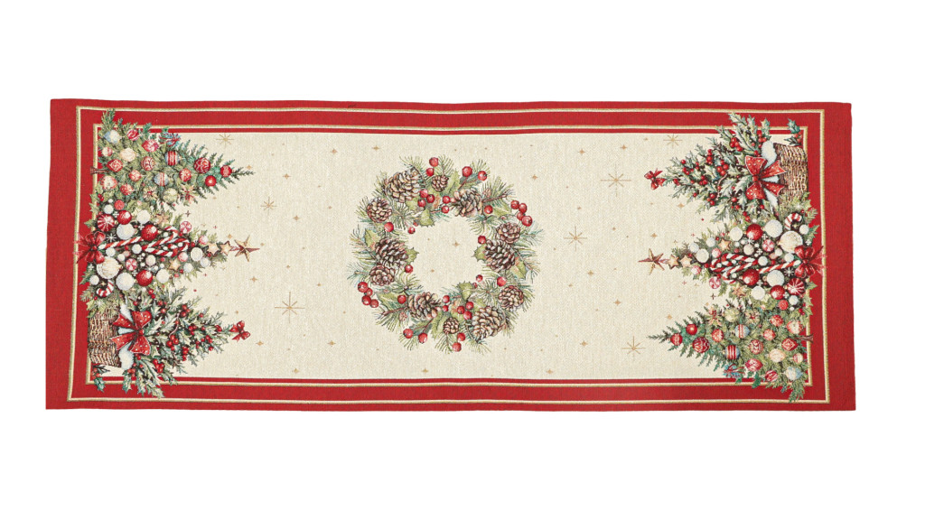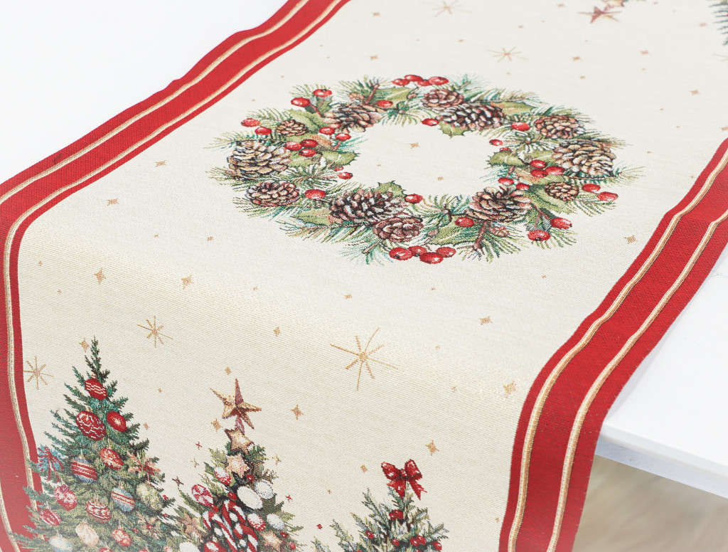 Elegáns gobelin asztali futó karácsonyi koszorú és díszített fenyőfa mintával. Anyaga gépi szövésű gobelin, amelyet arany lurexes szövés tesz még különlegesebbé.