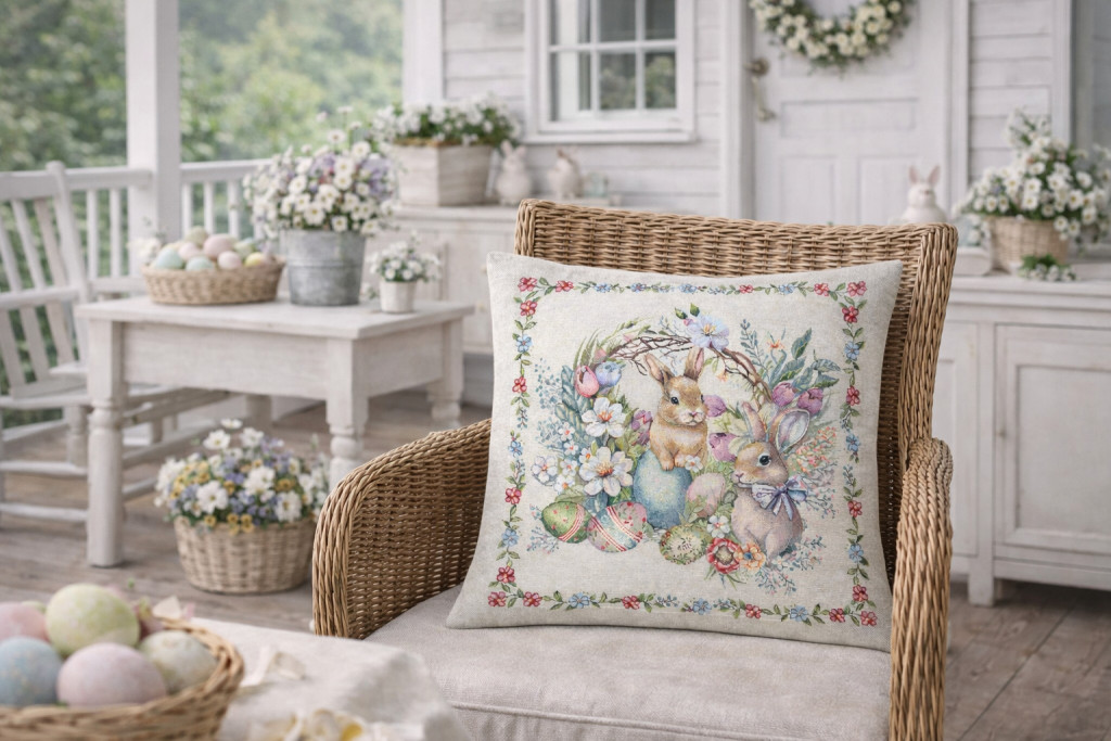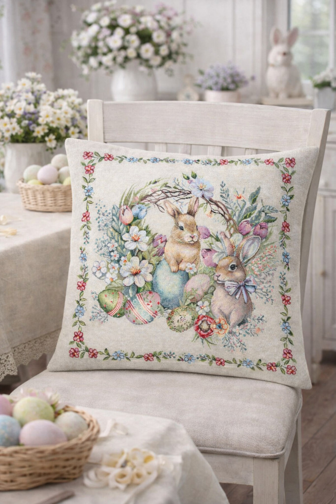 A gobelin anyag vastag, erős szövésű és formatartó, így ideális dekorációs párnahuzat kanapéra, fotelbe vagy ágyra. Nem nyúlik, nem bolyhosodik, a színek hosszú időn át élénkek maradnak. Különösen ajánlott húsvéti és tavaszi lakásdekorációhoz.