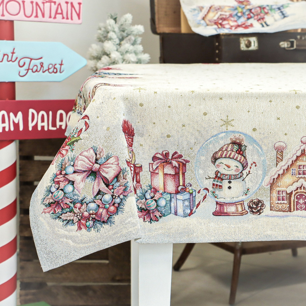 Teremts mesés ünnepi hangulatot ezzel a diótörős gépi gobelin asztalterítővel! A terítő mintázatán diótörő figurák, feldíszített karácsonyfák, ajándékcsomagok, mézeskalács házikók és karácsonyi gömbök jelennek meg. A középrész világos, finom arany pöttyökkel és hópelyhekkel díszített, így elegánsan emeli ki az asztali dekorációt vagy a tálalást. Mérete ideális 4-6 személyes étkezőasztalokhoz. A prémium minőségű, gépi szövésű spanyol gobelin tartós és elegáns, így mindennapi használatra és ünnepi alkalmakra is tökéletes.