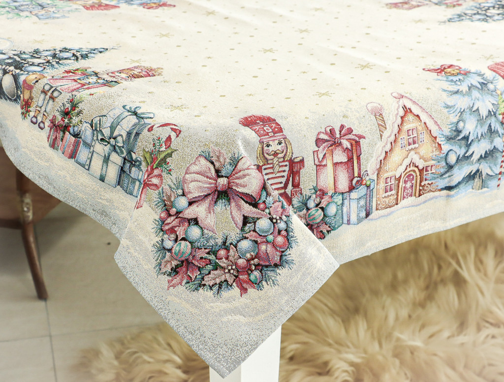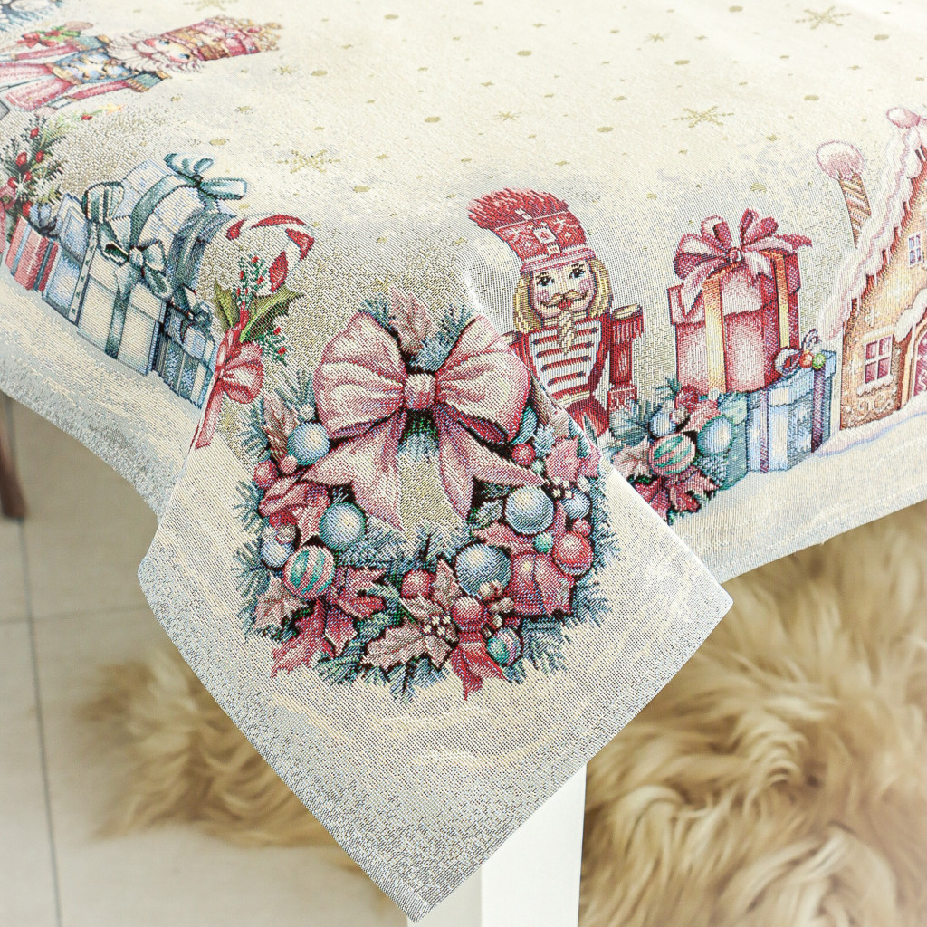 Teremts mesés ünnepi hangulatot ezzel a diótörős gépi gobelin asztalterítővel! A terítő mintázatán diótörő figurák, feldíszített karácsonyfák, ajándékcsomagok, mézeskalács házikók és karácsonyi gömbök jelennek meg. A középrész világos, finom arany pöttyökkel és hópelyhekkel díszített, így elegánsan emeli ki az asztali dekorációt vagy a tálalást. Tökéletes választás ünnepi családi vacsorákhoz, vendégségekhez vagy karácsonyi dekorációként komódra, kávézóasztalra is.