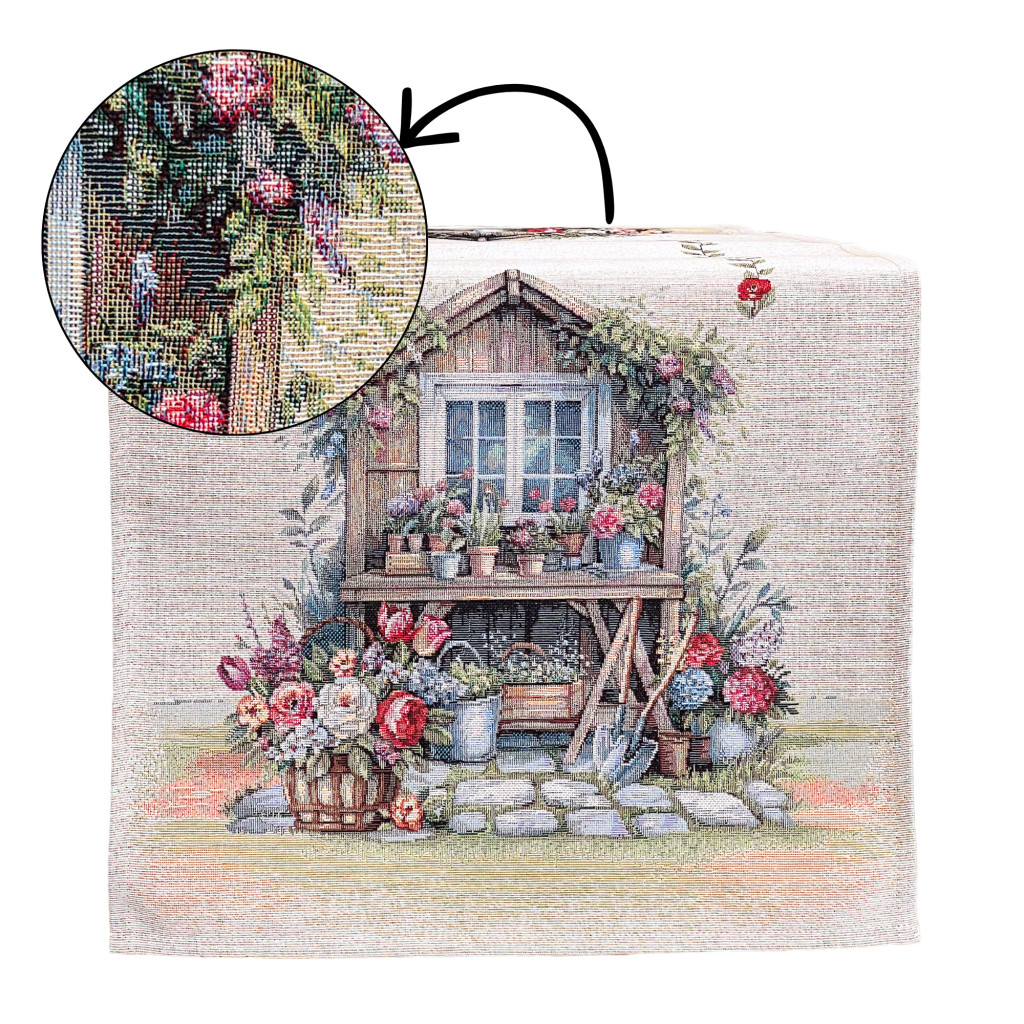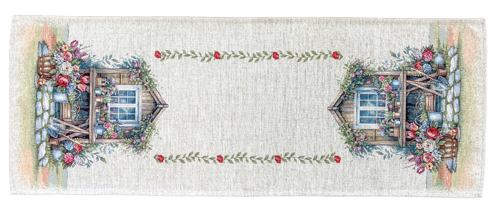 Hangulatos, vidéki stílusú gépi gobelin asztali futó virágos kerti jelenettel. Strapabíró, vastag szövésű anyagának köszönhetően praktikus és dekoratív választás étkezőasztalra vagy komódra.